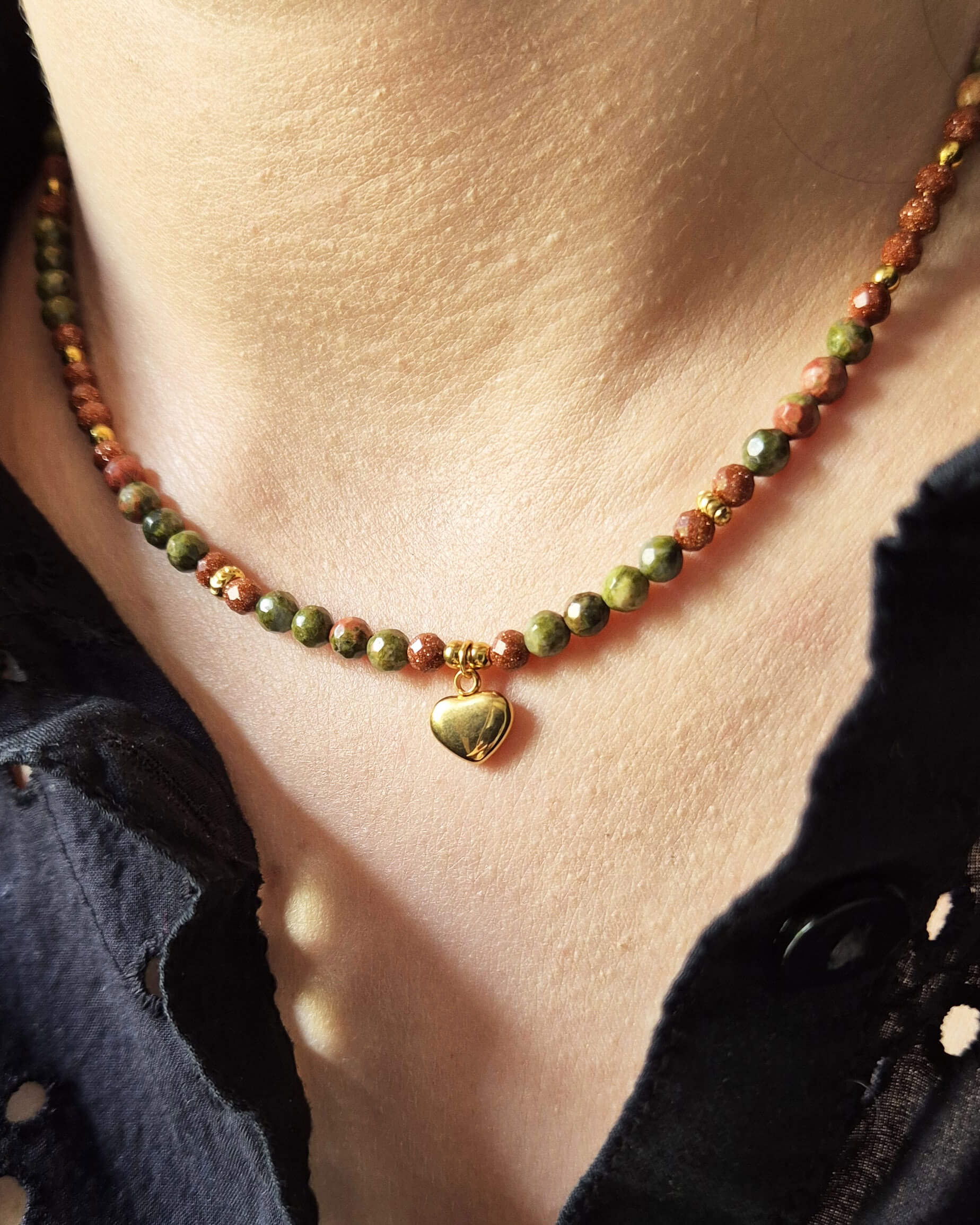 Naszyjnik z kamieni naturalnych: piasek pustyni i unakit. Naszyjnik inspirowany ciepłem jesiennych barw i spokojem zmieniającej się natury. Wykonany z naturalnych kamieni piasku pustyni i unakitu